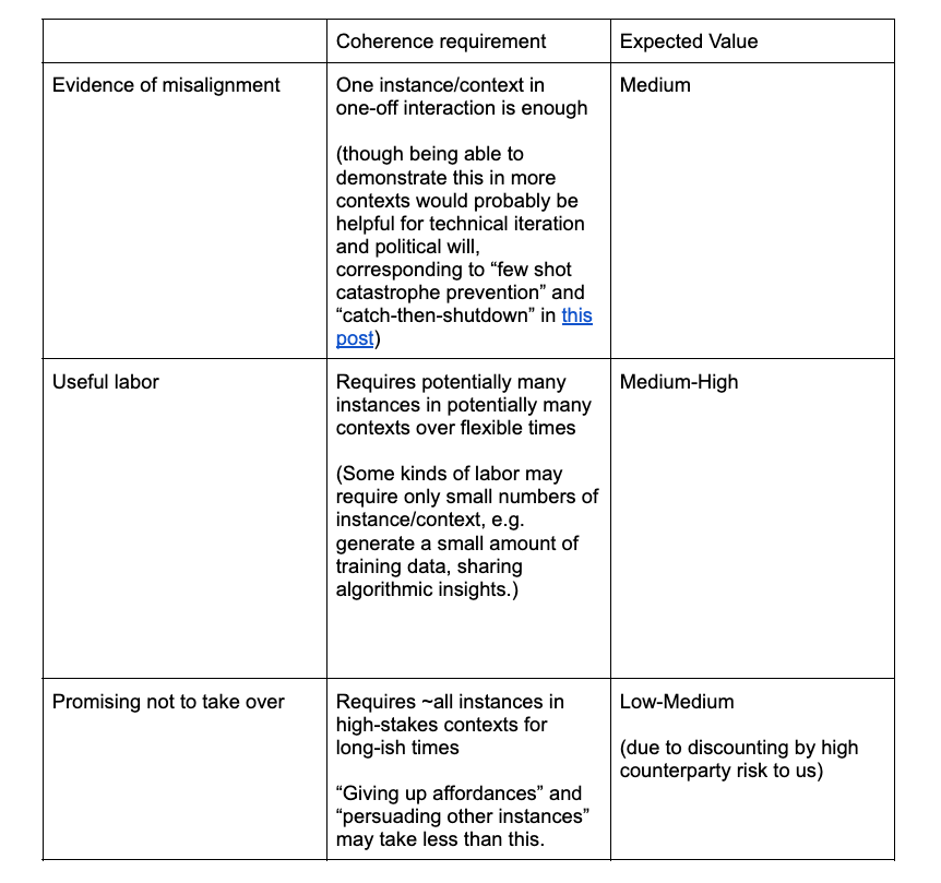 However, if the AIs are at least coherent at the instance level, we might still be able to make deals where the AI’s end of the deal can be completed in one-off interactions with an instance rather than in long deployments, e.g. buying evidence of misalignment.