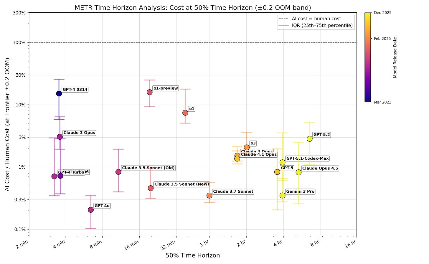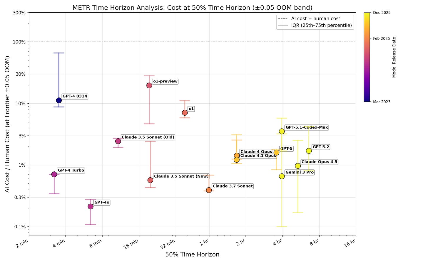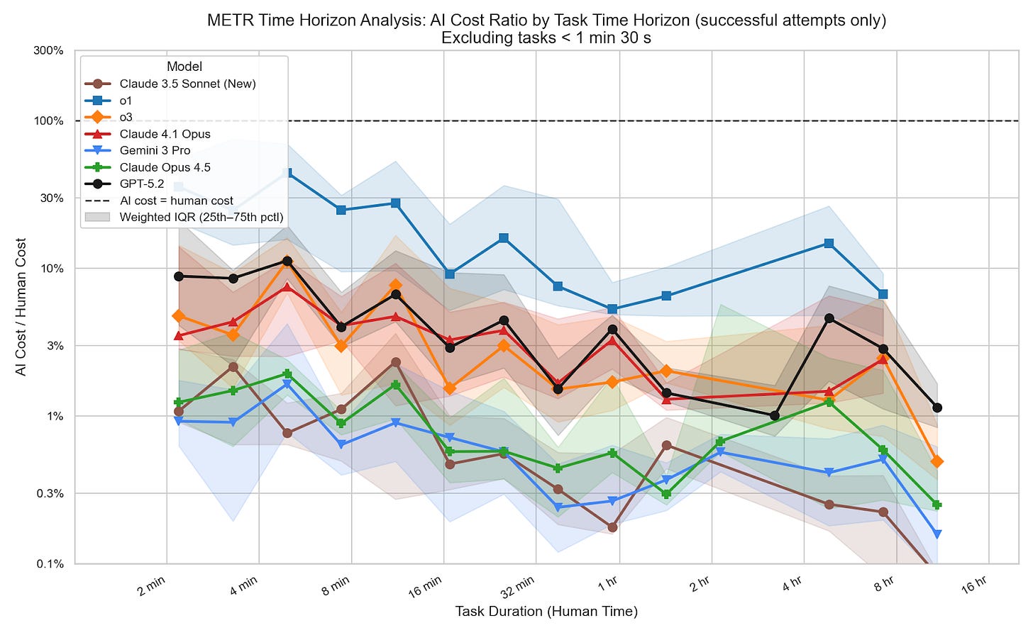 In this post, I analyze publicly available time horizon data from METR. I calculate cost ratio by estimating AI inference cost from token count (using OpenRouter pricing) and dividing by the human cost for each task provided by in the dataset. All calculations are performed using METR’s task weighting. I made some modeling assumptions to fill gaps in the METR dataset (see footnote).2 These assumptions shouldn’t affect my overall conclusions, because they shouldn’t significantly affect the trend across models.