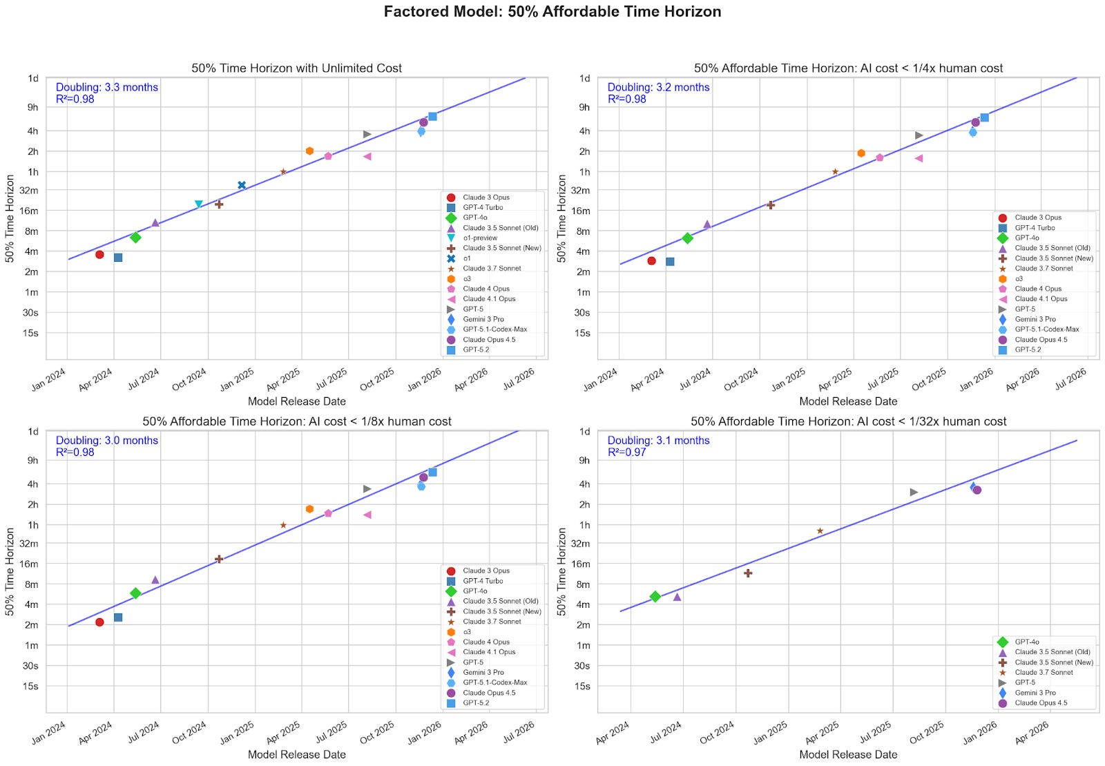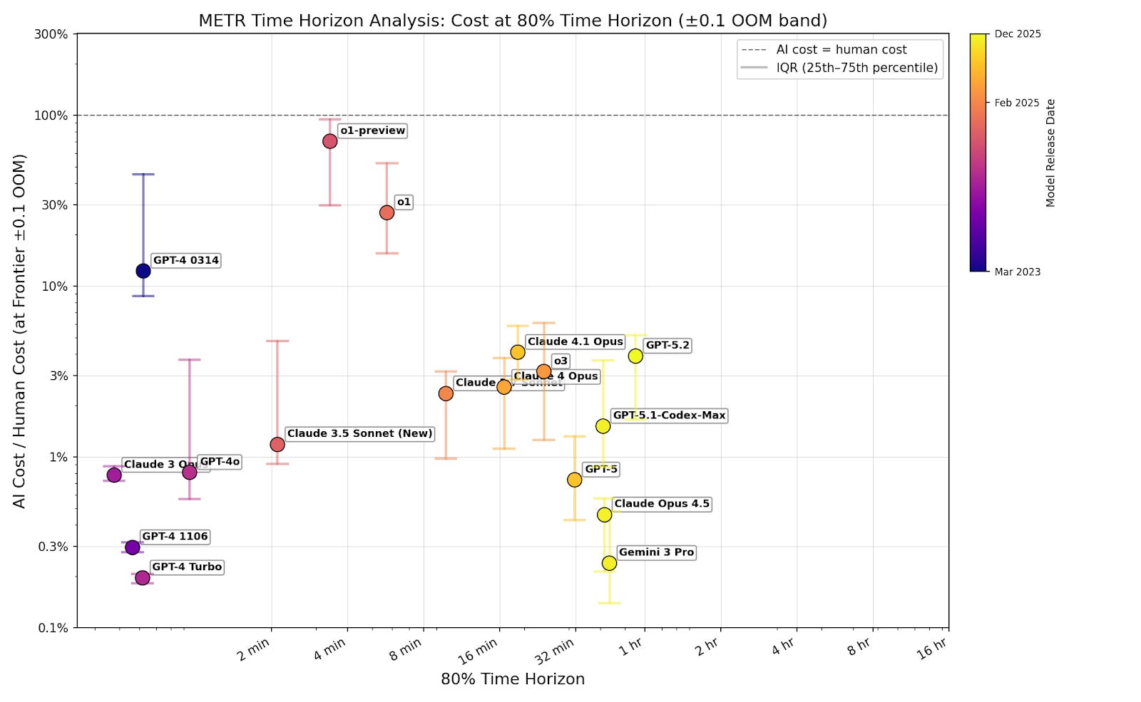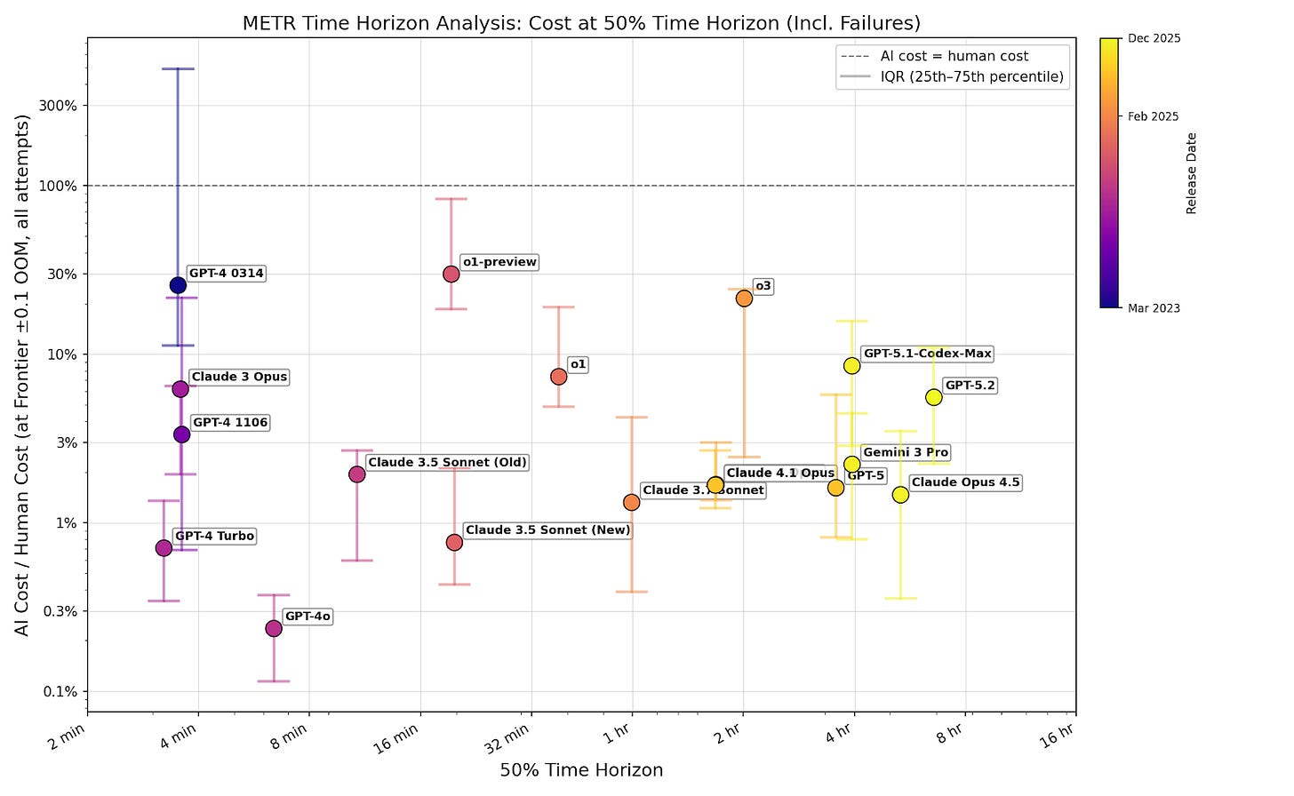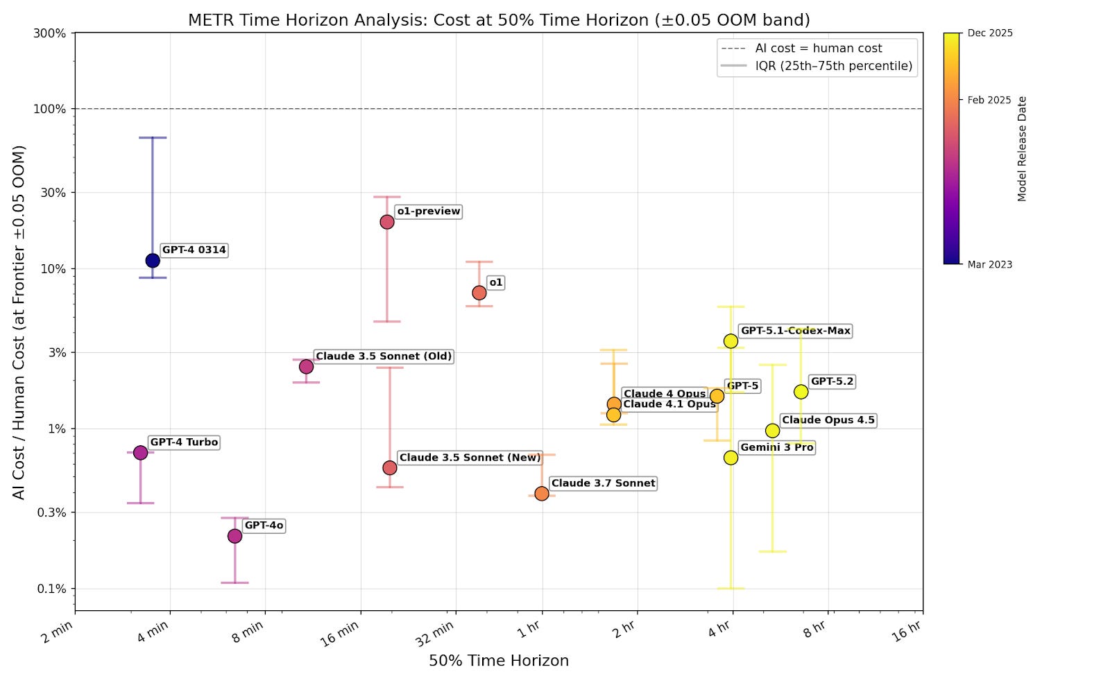 In this post, I analyze publicly available time horizon data from METR. I calculate cost ratio by estimating AI inference cost from token count (using OpenRouter pricing) and dividing by the human cost for each task provided by in the dataset. All calculations are performed using METR’s task weighting. I made some modeling assumptions to fill gaps in the METR dataset (see footnote).2 These assumptions shouldn’t affect my overall conclusions, because they shouldn’t significantly affect the trend across models.