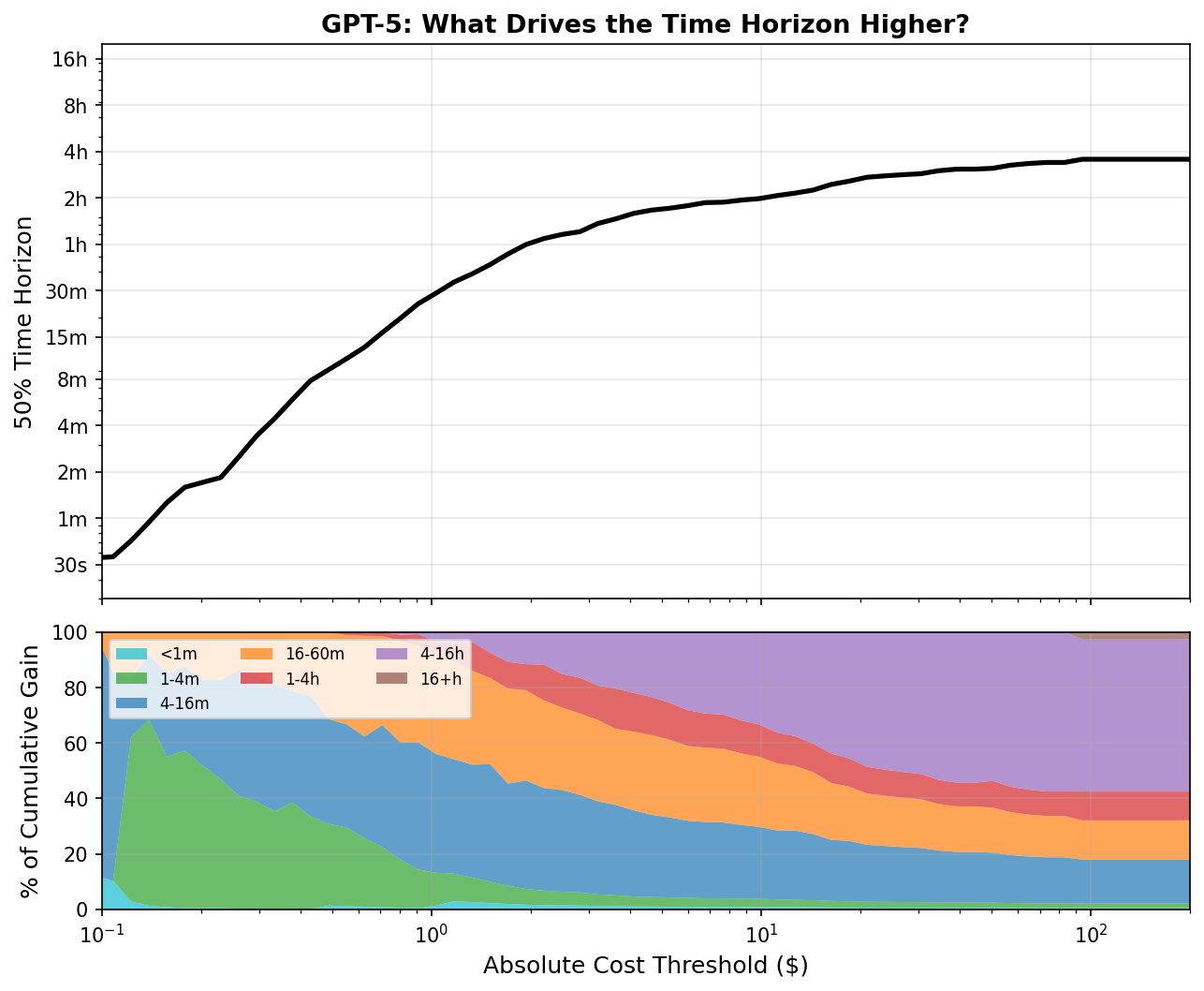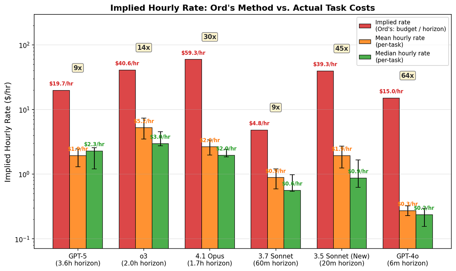 For example, my data shows GPT-5 succeeds on 1-2 hour tasks at a median cost of $1.29, but Ord’s method requires a $10+ budget to reach a time horizon in that range. The reason is that the 50% time horizon at the saturation point is influenced by passing tasks significantly longer than the horizon itself (see figure A2). So the per-task budget must be large enough to pay for the most expensive task necessary to reach the saturation point, which has a high absolute cost even if its hourly cost is low. Dividing this inflated budget by the shorter 50% time horizon produces an inflated hourly cost. In effect, hourly cost is set by the price of passing a 4-hour task, divided by a 1.6-hour horizon.