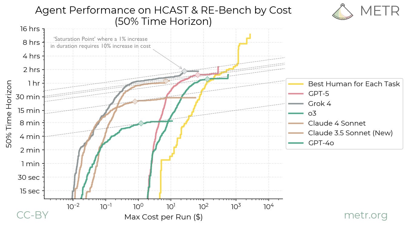 Ord uses this graph to find the hourly cost of AIs at their “saturation point” (where increasing the total budget doesn’t significantly increase the model’s 50% time horizon).