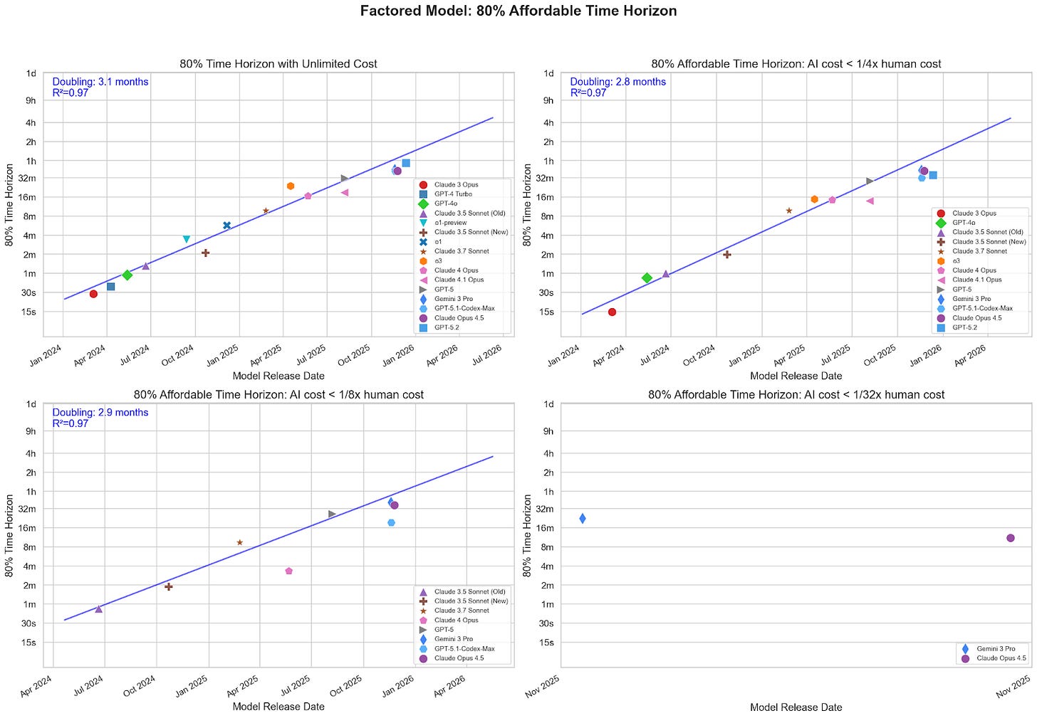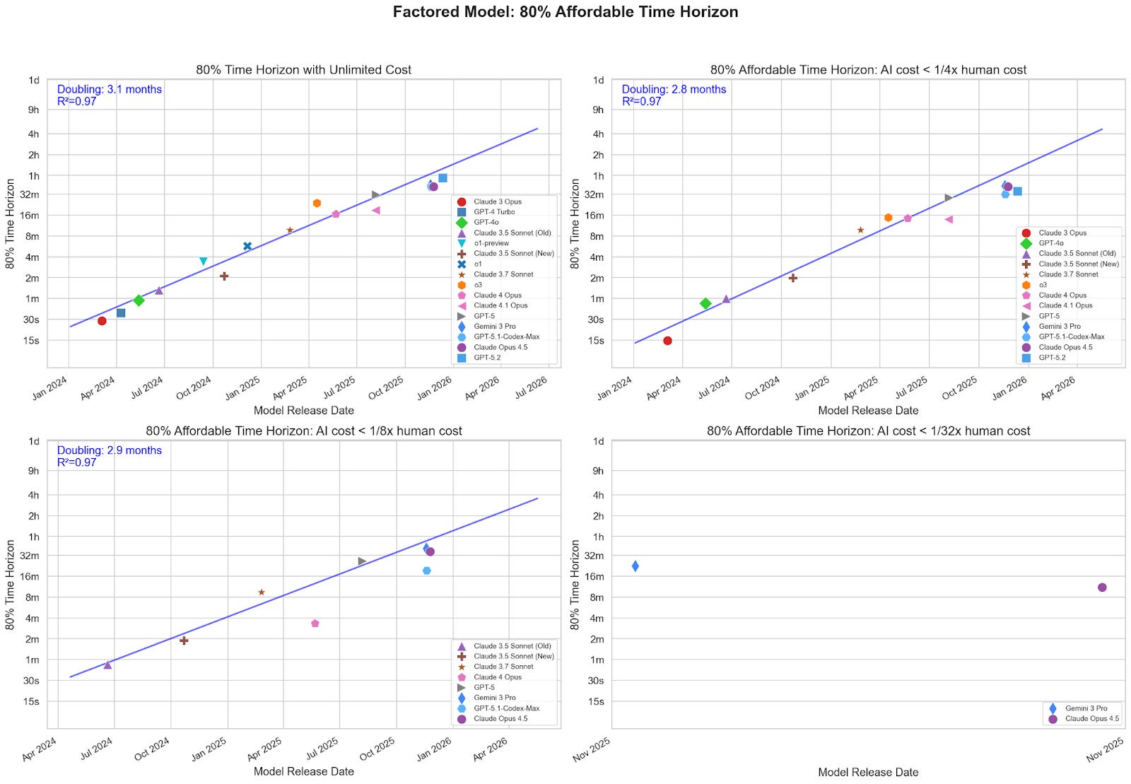 Ord also calculates “sweet spots”, where models are maximally cost-effective, using a similar methodology. Although the effect might be smaller, I suspect something similar would apply to the sweet spot analysis, because Ord’s method still inflates costs at shorter time horizons.
