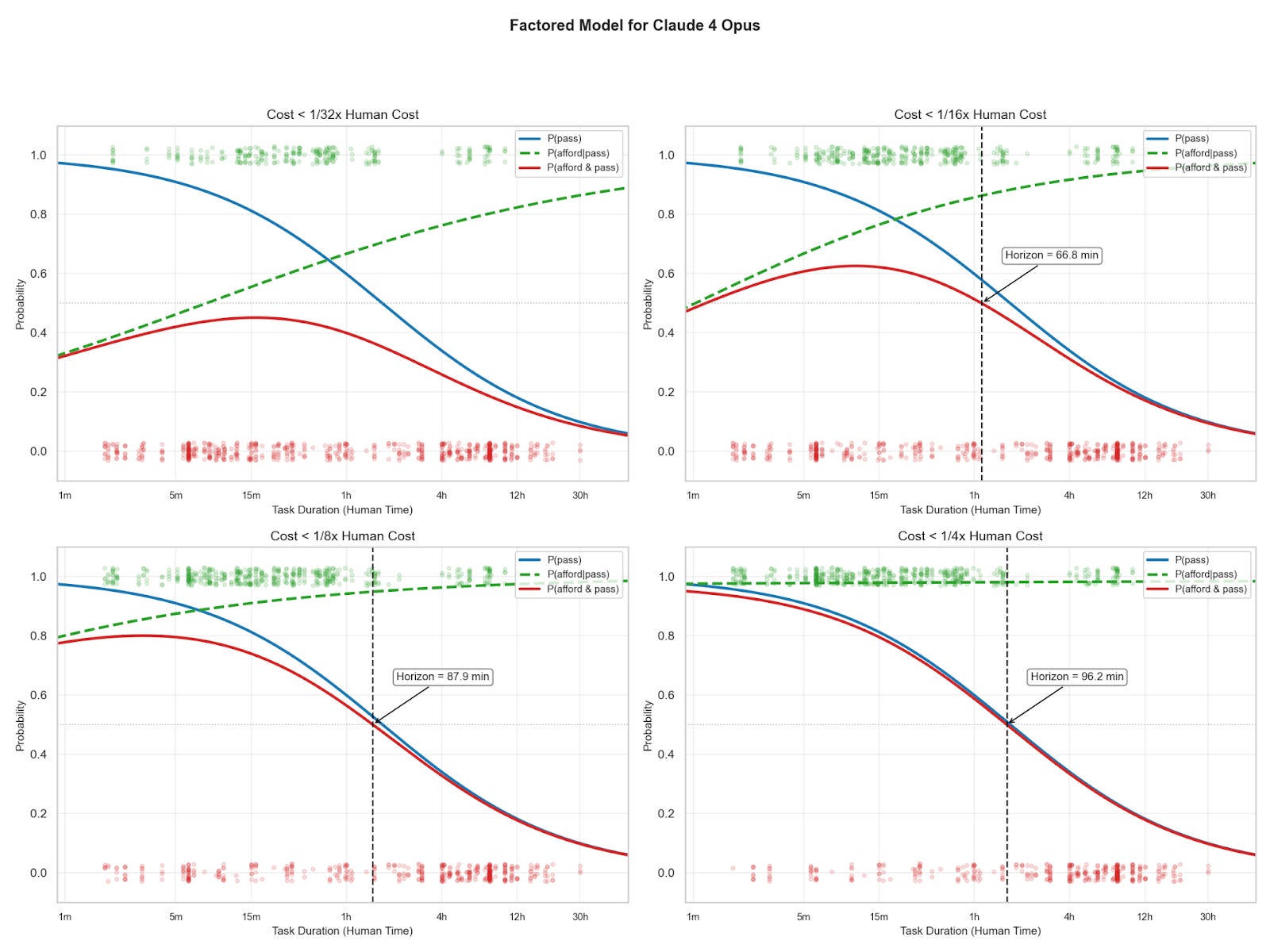 I model affordability and passing separately. I fit a logistic curve to the pass rate as a function of task length, and a separate logistic6 to the probability that any passing task is affordable. I do this because pass rate falls with task length, but affordability increases (see figure 2). Fitting a single logistic curve would fail to capture these opposing trends.