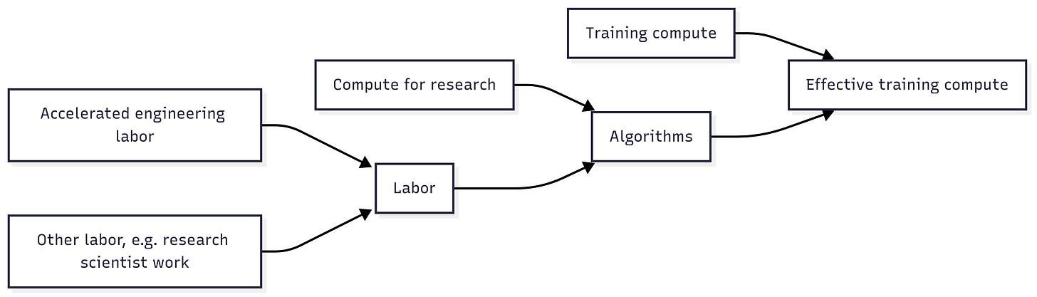 Research engineering is only a subset of the labor going into AI R&D, so this isn't as good as accelerating all labor by 2x. Further, labor is only one input going into AI R&D: another key input is compute for experiments. That said, engineering labor is a very important input and faster/more engineering labor doesn't just allow for implementing more experiments and making training runs more efficient: critically, it can also make experiments cheaper (use less compute) and better (see this breakdown from ai-2027 for ways accelerated engineering labor can speed up AI R&D).