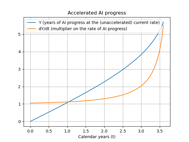 This curve computes overall AI progress. You might object that you expect AI R&D acceleration to increase exponentially, but converting from AI R&D acceleration to overall AI progress will result in a different function than exponential. It turns out that doing everything in terms of AI R&D acceleration and then converting to overall AI progress is equivalent; if you do this conversion (using the constants in "Appendix: How do speed-ups to engineering translate to overall AI progress speed-ups?"), you get the exact same numbers.