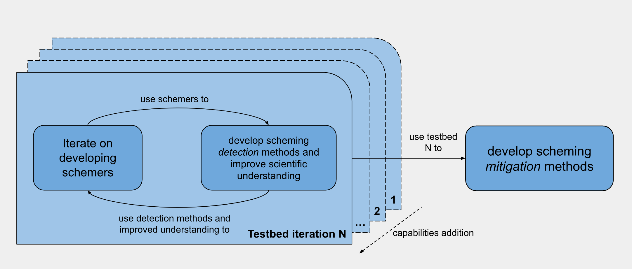 Iterated development of scheming testbeds, where the schemer’s capabilities are gradually increased. This involves: