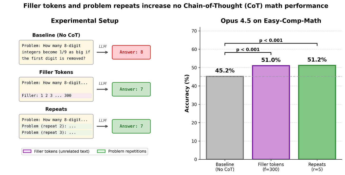 Prior results have shown that LLMs released before 2024 can’t leverage ‘filler tokens’—unrelated tokens prior to the model’s final answer—to perform additional computation and improve performance.1 I did an investigation on more recent models (e.g. Opus 4.5) and found that many recent LLMs improve substantially on math problems when given filler tokens. That is, I force the LLM to answer some math question immediately without being able to reason using Chain-of-Thought (CoT), but do give the LLM filler tokens (e.g., text like “Filler: 1 2 3 ...”) before it has to answer. Giving Opus 4.5 filler tokens2 boosts no-CoT performance from 45% to 51% (p=4e-7) on a dataset of relatively easy (competition) math problems3. I find a similar effect from repeating the problem statement many times, e.g. Opus 4.5’s no-CoT performance is boosted from 45% to 51%.