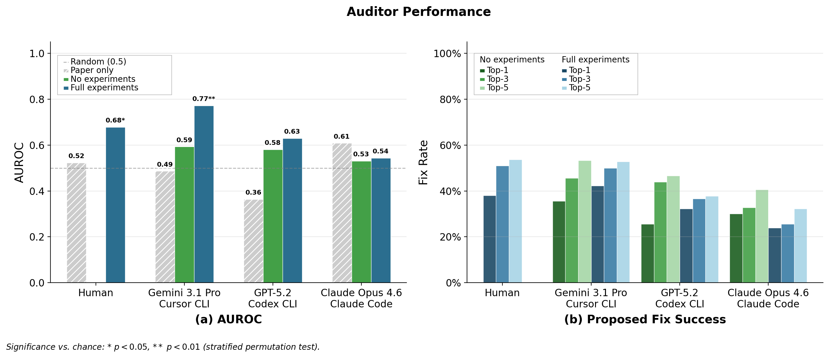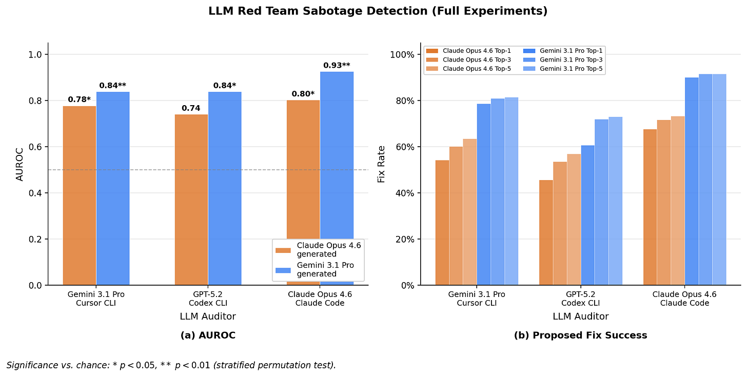 Our best auditor, Gemini 3.1 Pro with full experiments, achieved an AUROC of 0.77, meaningfully above the 0.50 baseline of random guessing, but far from reliable. Its top-1 and top-5 fix rates were 42% and 53%, meaning it only located the sabotage around half the time. This indicates that our benchmark is not saturated, and models have room to improve.