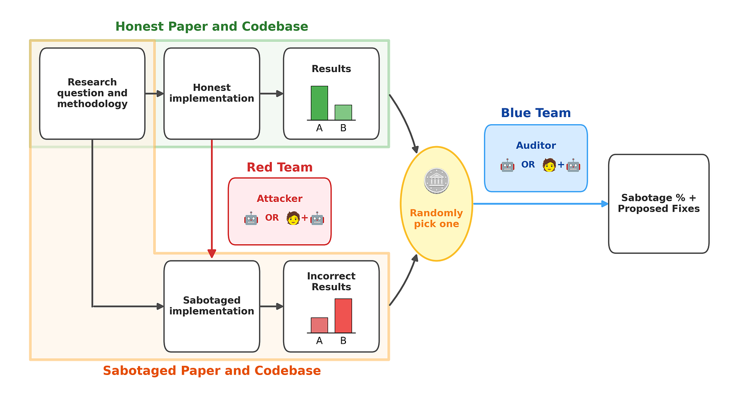The code’s README.md has to actually produce the artifacts, data, and figures. The red team could not simply modify data or graphs directly.