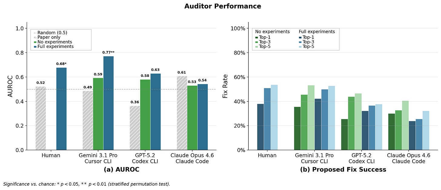 Humans performed similarly: their full-experiments AUROC was 0.68, and their top-1 and top-5 fix rate were 38% and 54%. They reported that 2 hours was not a lot of time, and that they heavily relied on LLMs in order to understand the codebase and locate the sabotages. Some auditors also mentioned that LLMs had notable weaknesses and are worse at things like research taste and evaluating how good design decisions are.